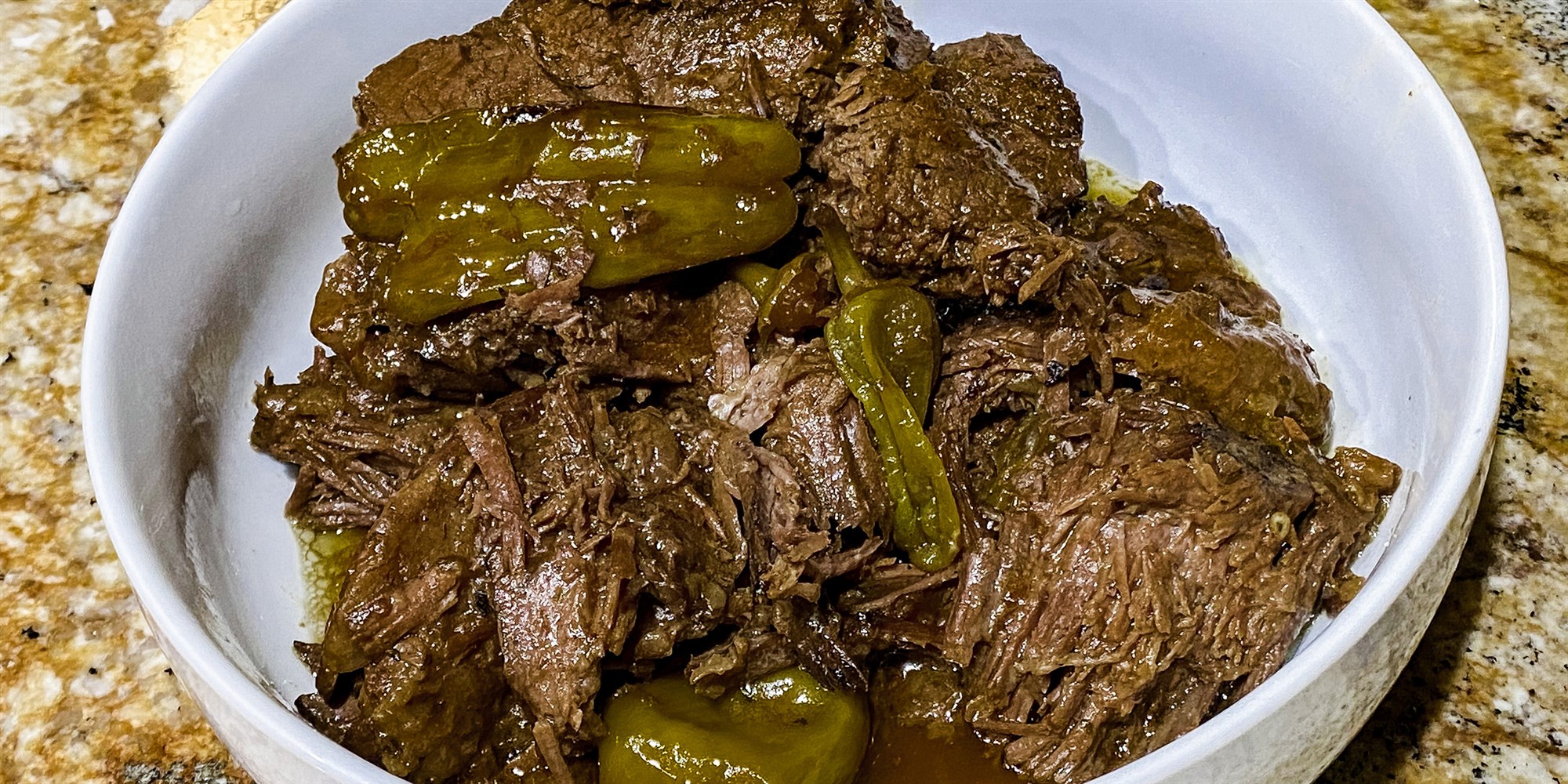 • In your slow cooker, add the roast and top with both packet mixes, a stick of butter (sliced into a few chunks), and a jar of pepperoncini peppers (the more the better, drained)